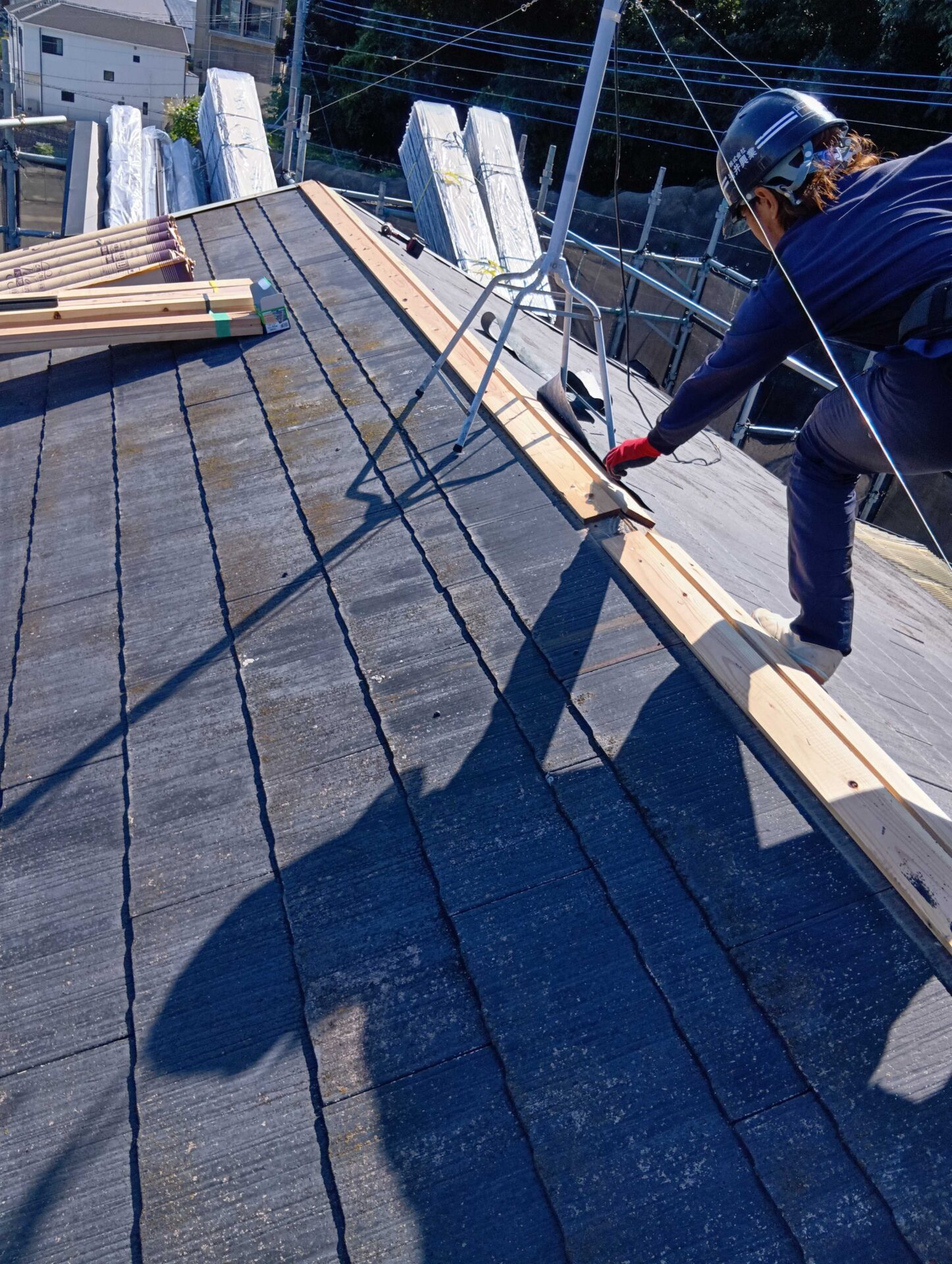 軒先から棟方向へ“水下→水上”の順で張っていきます