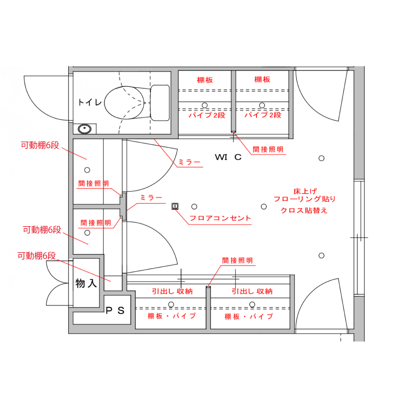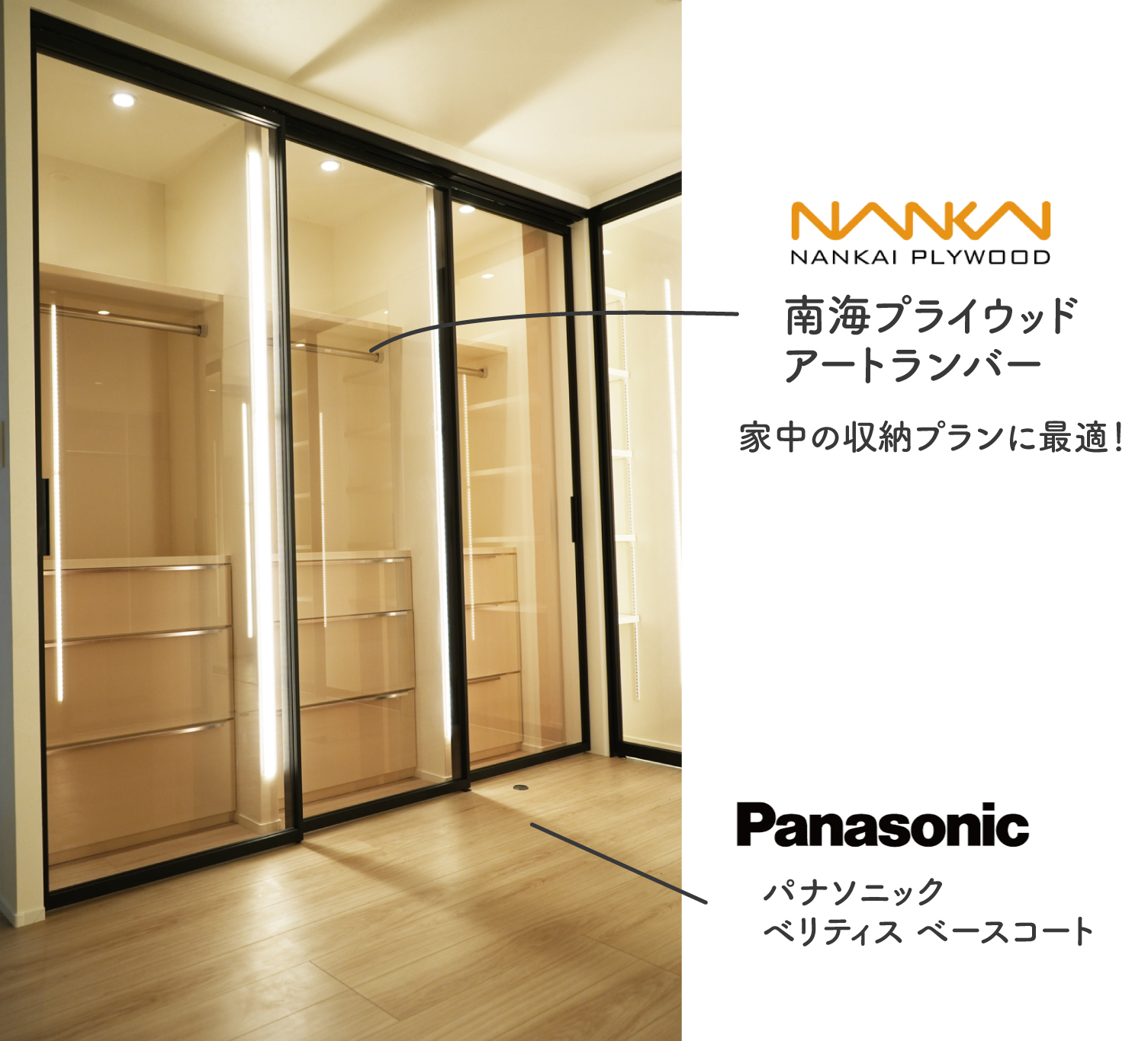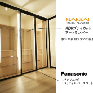 棚・ハンガーパイプは南海プライウッド製、収納家具は弊社大工のオリジナル造作です。