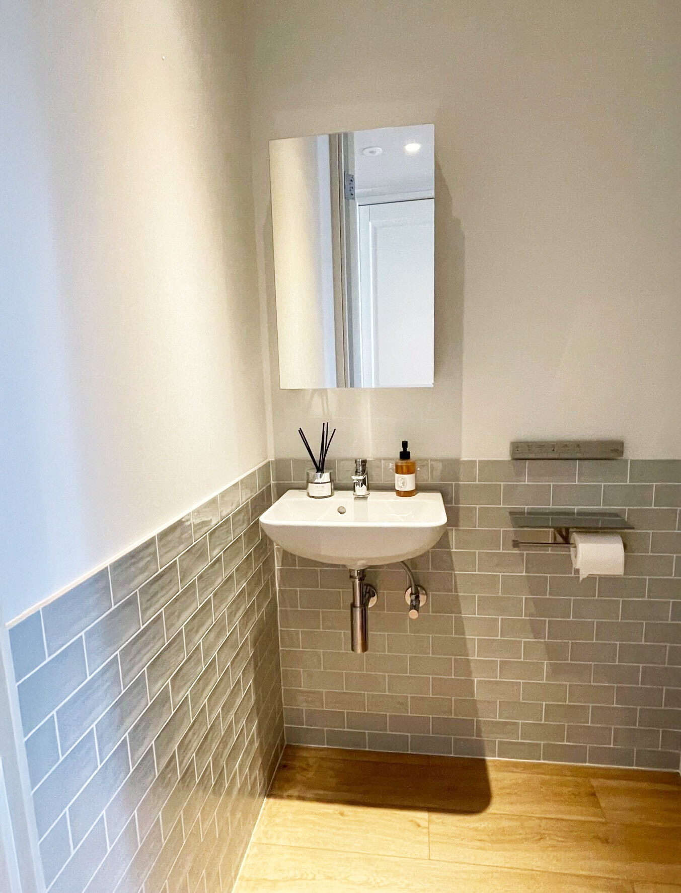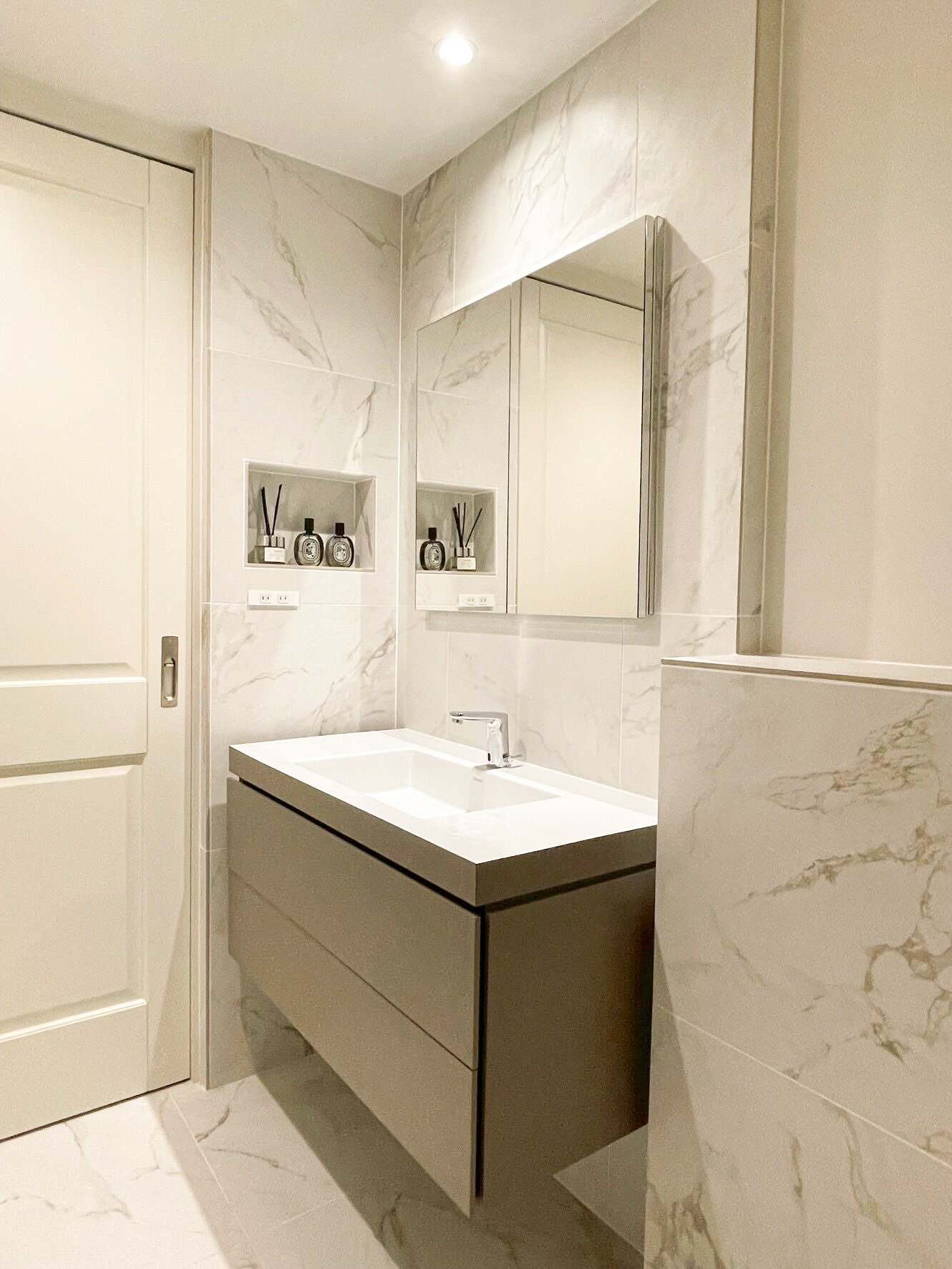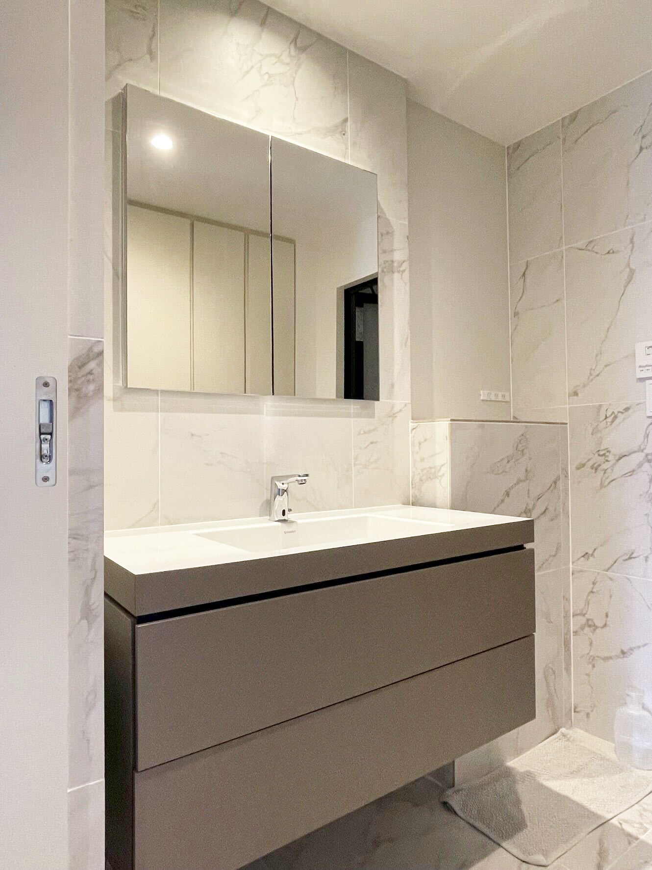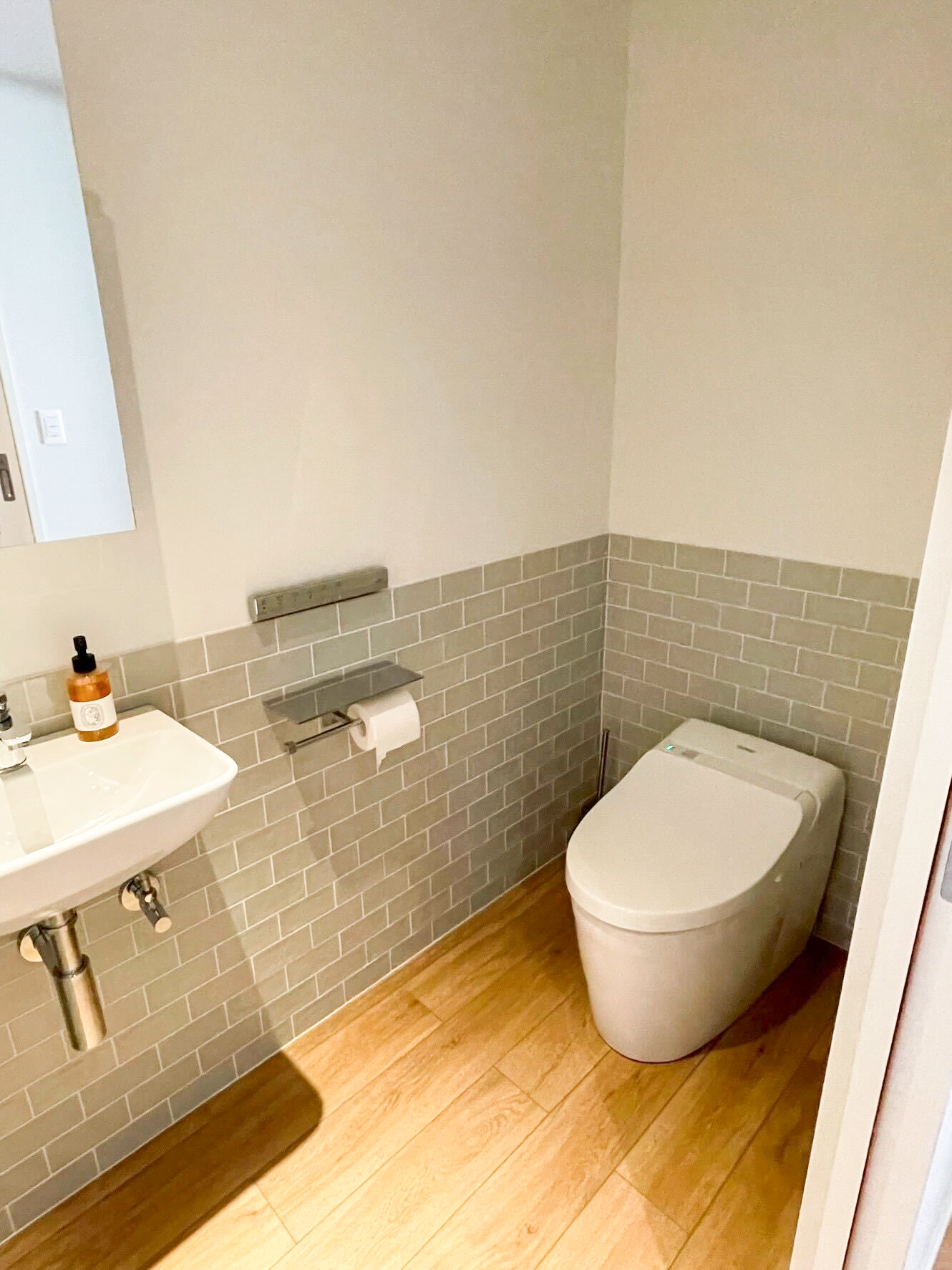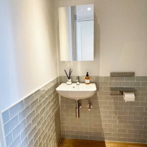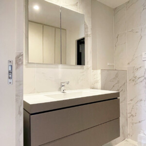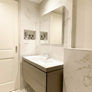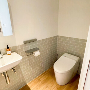 洗面室・浴室・トイレは、石目調タイルや落ち着いた色味で素材感を揃え、