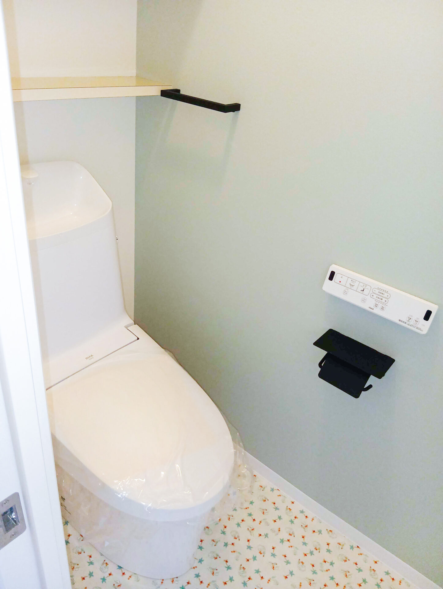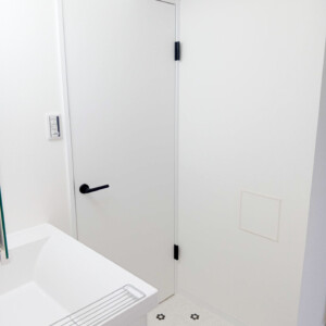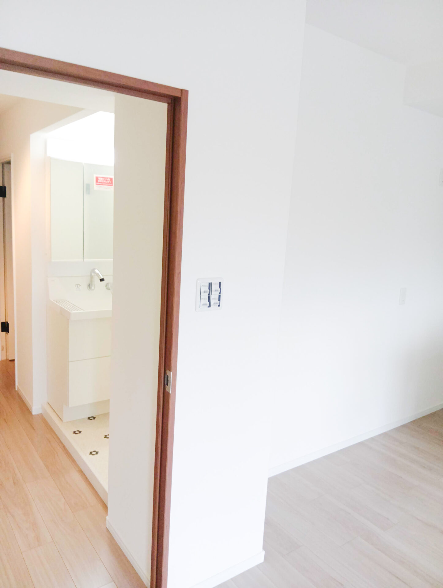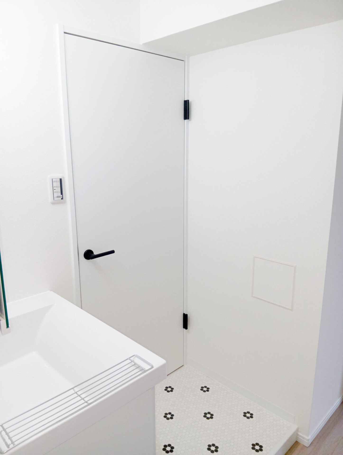 洗面空間には可愛いタイル柄のクッションフロアを使用し、取手にはさりげなく黒を取り入れてアクセントをプラス。細部までこだわったおしゃれな水回りに仕上げています。