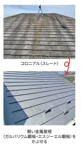 一般的な住宅では、スレート屋根(コロニアル)の上からガルバリウム鋼板やエスジーエル鋼板といった金属屋根材を重ね葺きするケースが多くみられます。