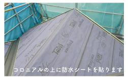 屋根カバー工法は、まず既存のコロニアルの上に防水シート(ルーフィング・下葺き材)を貼る作業から始まります。